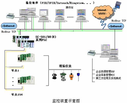 远程监控硬件主要包括上位机桌面电脑、SC-501/DE(E) 系列PLC、台达10SS(v5.9及以上)小型PLC及模拟量模块。SC-501/DE PLC是盟立公司最新推出的新版本控制器,主机自带双以太网口和COM1/2两个通讯口,其中以太网口作为主站支持通过MODBUS TCP协议和下位机通讯,COM2口作为主站支持通过MODBUS协议/自由口通讯和下位机通讯。这样就可以轻松实现和同样支持MODBUS协议的台达PLC的多平台接入,监控装置系统示意参见下图。