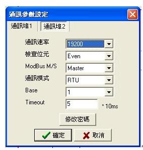 STEP 4: 设置COM2口通讯属性。设置波特率、奇偶校验、主从设置、ASCII/RTU、站号及Timeout时间。见下图: