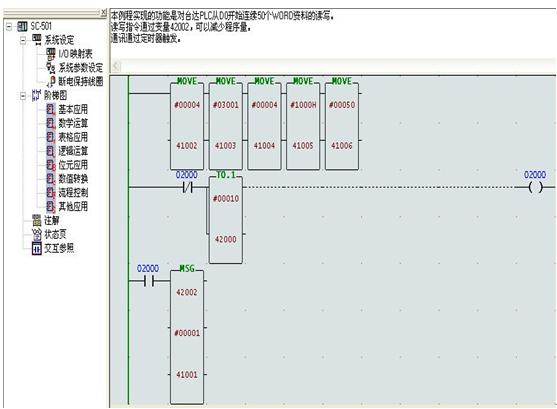 SC-501/DE MODBUS通讯指令MSG通过COM2口实现对下位机MODBUS设备的读出和写入。MSG指令是专为SC-501系列PLC 的MODBUS MASTER功能提供的应用指令,用户可以使用这条指令实现对其他MODBUS设备资料的读写。有关MSG指令的具体说明可以到网站ftp://,这边不再赘述。下面提供的是通过MSG指令读写下位机资料的说明: