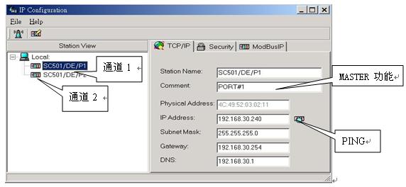 (3)TCP/IP 设置。如果能正常连接到SC-501/DE, 就可以修改 TCP/IP 参数了。 完成输入后, 使用 “PING” 指令可以测试 TCP/IP连接。 【Station Name】 和【Comment”】是可选项。 如果没有定义【Station Name】, 名字由IPConfig自动分配。
