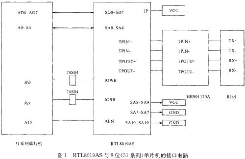 典型的8位机采用TCP协议接入Internet的以太网网络接口如图1所示。RTL8019AS以其优异的性价比,成为目前单片机以太网系统的首选以太网接口芯片。该芯片符合IEEE802.3 10Base2和10BaseT标准,具有自动奇偶检测和纠错功能,支持全双工工作模式。如图1中,RTL8019AS工作于8位跳线模式,数据线SD0~SD7与8位单片机(51系列)的数据线(AD0~AD7)相连,地址线A0~A4与8位单片机的地址线(A0~A4)相连。读写信号经74S04产生。RTL8019AS的基地址(配合引脚34(AEN))为0x8000H,对应RTL8019AS内部地址0x300H。RTL8019AS通过网络变压器HR901170A和RJ45接口与以太网相连接入internet,隔离网络上的干扰信号。