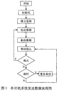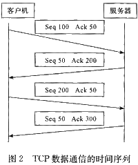 TCP协议是TCP/IP协议簇的核心,也是最复杂的协议。但由于其独特的自动检错和重发机制,实现了数据的可靠通信,但也正是由于其复杂性,在8位机上实现TCP协议通信耗时就比较多,传输速率低下。TCP协议的数据通信过程,以客户机为例进行分析。图2是典型的采集系统TCP数据通信的时间序列图。在建立连接后,由客户机向服务器发送数据。假设此时客户机的启始序列号为100,每次固定发送100字的样数据。服务器负责接受该数据,但不下发任何送数据,只确认所接收的数据,其启始序列号为50。对于单片机系统,由于其处理速度和内存资源的局限,通常的处理流程如图3。
