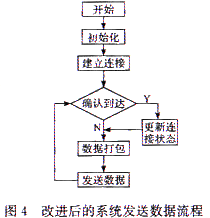 如图4所示,这里发送数据分组并没有等待确认分组这个过程。当有确认到达时,所做的工作正常情况下和图3所示的系统没什么区别,只是在当丢失了分组后的异常状态出现后,才在更新连接状态时处理了超时检测和出错重发等事件。之后在数据打包后也没有备份,这里是采用了大存储器数据偏移技术,也就是说在一个分组的确认未到达时,其原始数据是不会被覆盖的,新的分组打包在其后的内存单元中,这样就节省了数据备份所消耗的时间,不过无形中增大了对内存的需求。但本应用针对的是小分组情况,所以实际需求的内存并不大。实际工作中,为了使系统稳定工作,应建立2个TCP连接,一个用于服务器(上位机)发送控制命令和进行参数设定使用,一个用于客户机(下位机)上传采样数据使用。虽然TCP可以双向传送数据,可实际工作中,发现这样在高速通信下出错率比双连接单向数据通信要高出许多,主要是因为客户机(下位机)对TCP头部的确认号和序列号的调整容易出错所致。实际使用3~5个采样分组发送一个确认分组。因为延时太短体现不了效率的提高,但延时太长,如果出错,将产生大量重发分组的情况,影响网络性能,同时也增大了对内存的需求量。通过使用Snifferr软件进行监听比较,在同样的采样速率下,在改进前,发送包速率为500packet/s,接收确认包速率为500 packte/s,出错率5%,持续传输时间小于2 h;改进后,发送包速率为500 packet/s,接收确认包速率为183 packet/s,出错率小于0.1%,持续时间大于48 h。同时,同样的硬件条件下,理论上可以进一步提高采样速率。