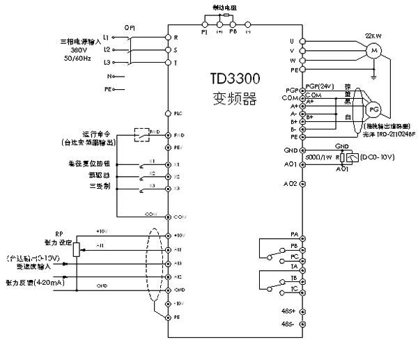 注意 :我们要保证在大卷径、大张力、低速或零速时电机有足够输出转矩,以防止电机在低速和零速时转矩不够,引起的收卷辊回车,TD3300应设置为闭环矢量控制模式,提高电机低频输出转矩。这样我们也需在电机上加装旋转编码器(光洋、1024线输出)。