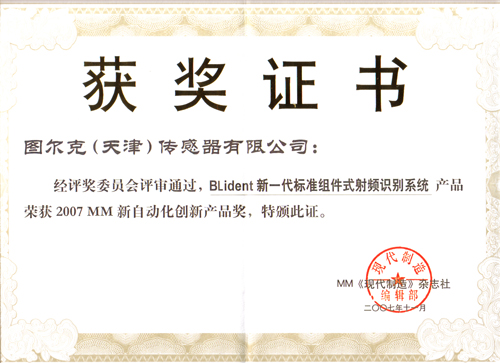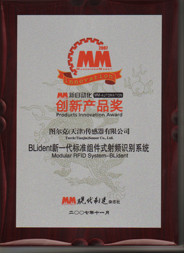 11月7日在上海揭晓的2006-2007MM新自动化创新产品奖,是图尔克公司RFID系统产品BLident在中国获得的第五个奖项。该奖项由中国国际工业博览会组委会和MM现代制造杂志社共同评选得出,颁奖典礼于2007第三届CIIF·MM·新自动化论坛期间举行。