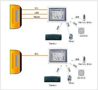 所有Automation Panel均支持USB。USB信号的传输通过DVI Link中一根单独的电缆(USB不是DVI标准的一部分)完成;USB全集成于SDL。每个Automation Panel带一个USB hub,hub上包括面板背面的两个USB接口以及面板前面位于盖板下的一个USB接口。USB外围设备,如CD-ROM驱动器、记忆棒、键盘都可以简便连接到操作单元,无需进入配电柜。APC620还可以通过USB引导。若连接两个显示设备,USB最大连接长度为30m;若连接一个显示设备,长度可达40m。