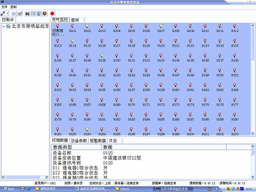 4.1实时监控 由设备状态显示区域和四个选项卡组成。每个远程控制终端设备有三种状态:报警、上线、开灯,分别对应显示区域中设备的三种颜色,红色代表报警,黄色代表上线,绿色代表开灯。一个设备可同时显示几种状态,例如设备显示“红-黄-绿” ,设备对应的状态为设备有报警、正常上线且处于开灯状态。设备只有正常上线了,控制中心才能对设备进行相应的操作。