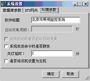 环境参数,主要是系统中用到的或者是显示的参数,有系统标题、是否支持群发、关灯延时、是否将该机设为主机。如下图所示。其中“系统发送命令时是否支持群发”,单击其前的选框后,用户的操作将对所有在线的设备均有效。“关灯延时”是指执行手动操作后,设备的“开灯/关灯”状态维持延时时间后按照时间表工作。例如:设定关灯延时:2分,执行手动开灯后,开灯状态维持2分钟后,如果这个时刻在时间表内为开灯状态,灯继续处于开状态,否则灯将关闭。“是否将该机设置为主机”,点击选中后,将本机设置为主机,就能把报警信息、日志写到数据库里,非主机就没有这个功能。