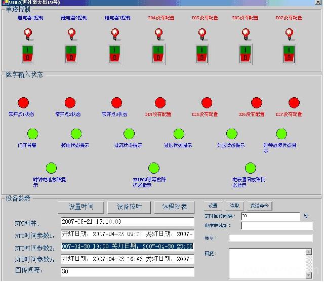 设备参数,包括设置时间、设备校时、远程抄表、设置、发送命令等。其中设置时间功能将管理系统设定的3个时间方案下发到下位机终端设备,下位机再上传到本界面的RTU时间参数1、2、3显示出来。设备校时功能将上位机电脑的时间下发给下位机终端设备,下位机再上传到本界面的RTU时钟。远程抄表功能将该远程控制设备控制的灯的耗电的电度数读到上位机并显示出来。设置的功能,在定时回传间隔框内输入20,然后点击设置,回传间隔框内的数字将变成20。还可实现远程修改DTU(数据传输单元)的IP地址和端口号,假定IP地址 端口号5384 具体操作是在命令框内写入命令“at+ihsrv=,点击发送命令,看到“回复”内容,即可。