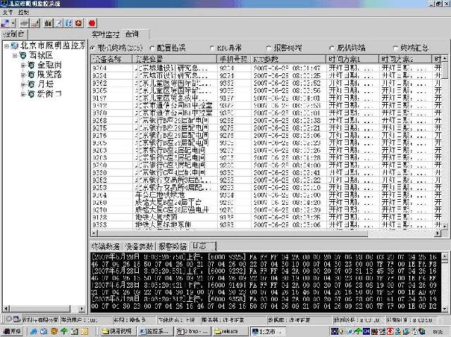 实时监控的四个选项卡,分别是终端数据、设备参数、报警数据、日志。终端数据和设备参数是显示用户选中的设备的相关信息。而报警数据显示当前系统中所产生的报警。日志是显示当前系统发生的数据传输记录,有下位机上传上位机的数据,也有上位机下发到下位机的数据。