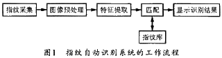 指纹识别是用取像设备读取指纹图像,并通过识别软件提取指纹图像中的特征数据,然后根据匹配算法得到的结果来鉴别指纹所有人的身份,这种生物特征识别技术主要涉及指纹图像采集、图像预处理、特征提取、特征匹配等过程。识别时,可由计算机对预存的模板与当前获得的特征数据进行比较,以计算出它们的相似程度,从而得到两幅指纹图像的匹配结果。指纹自动识别系统(AFIS)的简单流程如图1所示。