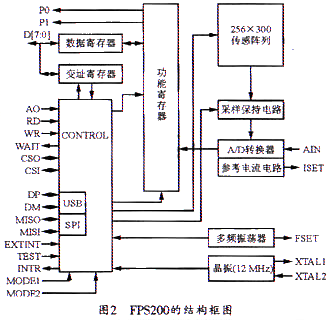 FPS200指纹传感器由256×300个电容传感阵列组成,其分辨率高达500 dpi,工作电压范围为3.3~5 V,传感器内部有8位ADC,并具有两组采样保持电路。FPS200的结构框图如图2所示。
