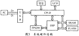 本指纹识别系统中的特征匹配和数据库模块可在主机上通过软件实现,指纹采集、图像的预处理以及特征提取部分则可由DSP+CPLD完成。系统的硬件结构如图3所示。