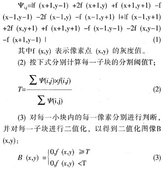 二值化处理是指整幅图像处理成仅黑(灰度值为0)和白(灰度值为1)的过程。二值化的方法很多,关键在于阈值T的选取。采用以边缘强度为权值的灰度平均法可直接得到分割阈值,其具体实现步骤如下: