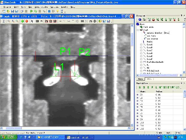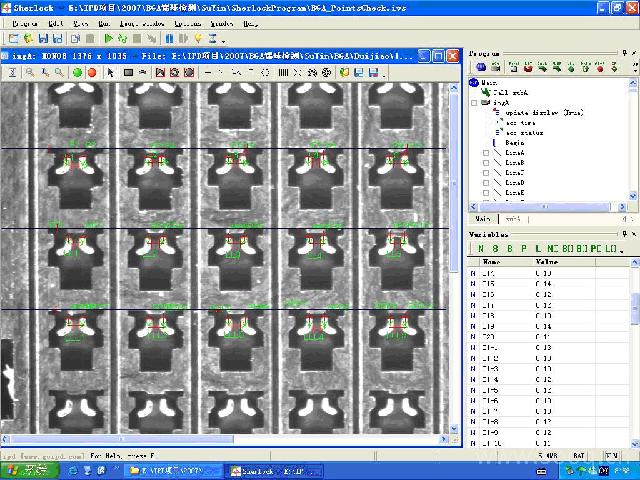运用VA41shorlock7软件中的测量直线之间的距离的办法来测量两组数据,为了保证精度,必须将Socket分为四个区域。依据:FOV=40*40mm.那么分成四个部分则得出:FOV=20*20。使用的相机的分辨率是1375*1026。精度=20/1376=0.015mm,可以达到客户的检测要求。如果不分区。则精度=40/1376=0.029不符合标准。