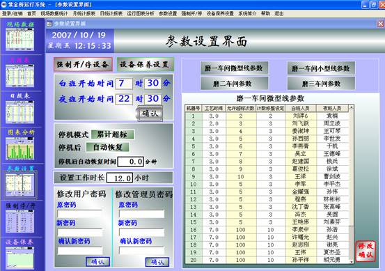 该轴承厂拥有4个车间共122台轴承生产设备,每台设备需要采集上件工时,计数修整实际值等参数,同时为了避免工人没有按照规定操作,使产品工时低于工艺时间的要求,从而造成产品质量不稳定的问题,系统会按照设定判断每个班次的超标情况,如果连续超标或者累计超标(可以设定超标模式),达到一定次数就可以自定锁定设备,而解锁可以由相关人员手工解锁或者系统到达设定时间后自动解锁。轴承厂分为白班和夜班,需要对产量、超标次数、开机时长、运转时长、超标率等分别统计。每台设备的工艺时间、计数修整、工作人员等内容载上位机中都可以自由设定。