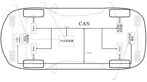 电动车实物模型中使用的分布式四轮电子差速系统由一个中央控制器、四个电动轮控制器及CAN总线网络三个部分组成,其在电动车实物模型上的布局如图1所示。