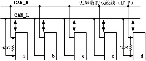 整个网络中共含有五个CAN节点:四个电动轮电机控制器a、b、c、d,以及一个电动车中央控制器e。