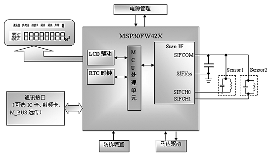 使用MSP430FW42X开发的水表、热量表,系统直接采用内部流量扫描模块(Scan IF)不需要外部流量检测IC ,直接取代TMS3723B ,大大简化了系统硬件设计和软件设计,并且提高了系统的稳定性。使用 MSP430FW42X 开发的无磁水表系统框图如下: