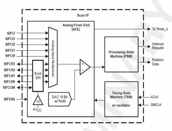 SCAN IF模块能够在低功耗下自动检测线性或旋转的运动。 SCAN IF模块由三部分组成:模拟前端(AFE) 、信号处理状态机(PSM) 、定时状态机(TSM) 。其中模拟前端的主要元器件是一个“VCC/ 2” 发生器,一个比较器和一个10位DAC 。模拟前端用来激励传感器,检测信号电平并把信号转换为数字形式;这些数字信号进入信号处理状态机,信号处理状态机 计算出转动(流体流量)和它的方向 ;定时状态机用来控制模拟前端和信号处理状态机。