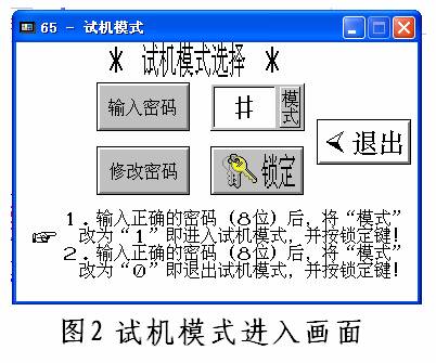 D、可选择试机模式,用于机械的磨合,符合管理员权限的人才可选择试机模式,对不同的用户进行不同的操作从而保证系统安全。如图2所示;