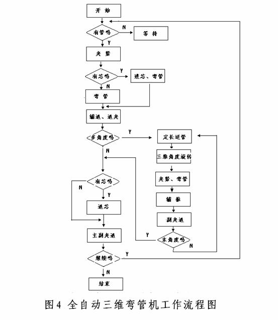 系统主要工作步骤有弯管主副夹夹紧、有芯进芯并计时、弯管、辅推弯管、慢弯进行、主副夹退夹、步进电机动作旋转、退弯动作、退芯完成等。其主要工作流程如图4所示。