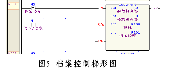 根据不同用户的实际要求,需要产品多样性,弯管角度参数灵活可变的特点,三维弯管机系统在设计时要求PLC拥有强大档案处理功能。在系统设计中,采用了FUN160功能指令,如图5所示。当M1=OFF,M0由0→1时,自暂存器R0开始,将长度为暂存器R101的资料写入以档案寄存器F0开始的区块中(指标暂存器R100的资料为F0的第N个区块);当M1=ON时,M0由0→1时,自资料寄存器F0开始的第N个区块(指标暂存器R100的资料为N)的暂存器资料存入以暂存器R0开始的资料暂存器区(该区长度为R101的资料)。