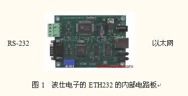 第一代以太网工业通信产品是以以太网/RS-232转换器为典型的。波仕电子是国内最早从事以太网/串口转换器的开发厂家之一。型号为以ETH232的以太网/RS-232转换器(如图1)用于将一个以太网口转换成为一个RS-232串行口。以太网/RS-232转换器实现以太网与RS-232串口设备相互通讯的一种协议转换装置(以太网协议-串行通信协议)。在通信主机 (以太网)和RS-232串口设备之间,无论是通信主机发送信息至指定的RS-232串口设备或是RS-232串口设备发送信息至指定通信主机,都可以经其轻易且正确地传输。波仕的ETH232是专门为工业通信设计制造的,特别强调对工业通信的适用性。比如我们用工业通信开发常用的Visual BASIC 和 Visual C++语言的通信控件编程后进行通信检测,波仕的ETH232可以在各种版本的Windows下很流畅地正确通信并且对RTS/CTS、DTR/DSR握手信号的控制与监测也很正确,而有些市售的以太网/串口转换器却不能够通过这样的检测。