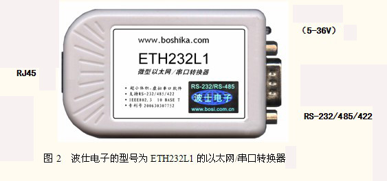 第二代以太网工业通信产品可以从以太网口直接扩展出RS-232、RS-485、RS-422口。波仕电子以太网/串口转换器(型号:ETH232L1)用于将一个以太网口转换成为RS-232、RS-485(半双工)或者RS-422口(全双工),如图2。波仕ETH232L1微型以太网/串口转换器具有超小型的专利外形(80*23*47mm)、RS-232、RS-485、RS-422通用(配有接线端子),可以虚拟成为本地COM串口(COM1-COM256)、无须修改已有的串口通信软件。同时波仕赠送具有自主知识产权的通信源程序(VC++,VB、BC可以嵌入用户通信程序)以及拥有版权的以太网-串口影射程序。