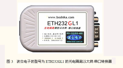 第三代以太网工业通信产品不仅可以从以太网口直接扩展出RS-232、RS-485、RS-422口,而且实现了光电隔离。波仕ETH232GL1光电隔离微型以太网/串口转换器(如图3)秉承波仕转换器的一贯特色,具有超小型的外形(80*23*47mm)、RS-232、RS-485、RS-422通用,可以虚拟成为本地COM串口(COM1-COM256)、无须修改已有的串口通信软件。