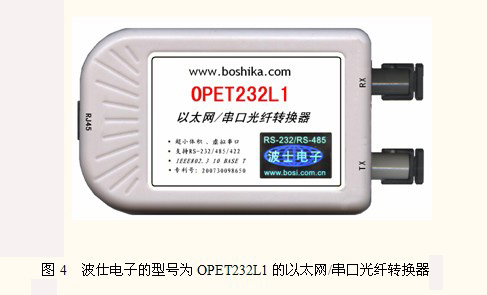 第四代以太网串口通信产品从以太网口直接转换出一对光纤收发头用于传输串口信号(如图4)。波仕电子发明和首创了以太网/串口光纤转换器、同时也是世界上唯一的以太网/串口光纤转换器。波仕电子的OPET232L1(多模)和OPET232SL1(单模)是最新一代以太网光纤通信产品,直接从以太网口转换出一对光纤收发头用于传输串口信号。波仕微型以太网/串口光纤转换器具有超小型的外形(74*23*47mm)、可以将以太网口虚拟成为本地COM串口(COM1-COM256)、无须修改已有的串口通信软件。驱动程序同波仕ETH232L1系列转换器。由于OPET232L1(或OPET232SL1)传输的还是串口信号,所以必须成对使用或者与波仕的OPT系列串口/光纤转换器配对使用。由于采用光纤作为通信传输介质,具有隔离高电压、防电磁干扰、传输距离远等优点。OPET232SL1的传输介质为单模光纤、OPET232L1的传输介质为多模光纤,但是外形和驱动程序是完全一样的。OPET232L1(或OPET232SL1)的供电也进行了改进,改为通用的T型USB口供电插座。普通的MP3、小灵通手机的充电器都可以当电源使用。供电插座旁边带LED指示灯。本产品受以下中国专利保护:200730098650、200630307752、ZL2002284234,侵权必究!