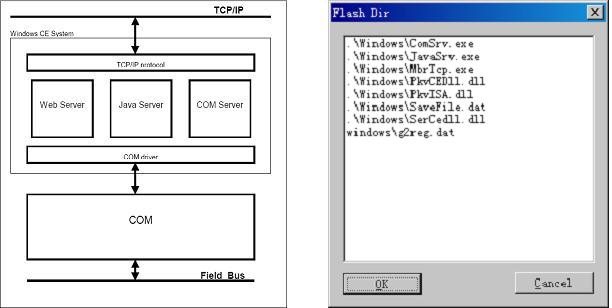 对于型号PKV40-PB来说,其内部嵌入了赫优讯的通讯模块COM-PB,因此它是一个Profibus主站;同时嵌入式主板上提供了一个以太网通讯口,因此它也可以实现以太网通讯,所有通讯功能的实现由内部FLASH中的EXE程序来执行,下面是PKV的内部软件结构图和内部FLASH程序: