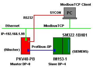 如上图所示,PKV40-PB作为DP主站,地址为0;IM153-1作为DP从站,地址为4,同时扩展了一块16DO的SM322模块以方便观察数据交换;PC机上运行ModbusTCP客户机软件,与作为ModbusTCP服务器的PKV通讯,PKV以太网端口IP为。采用赫优讯SYCON软件来完成PKV的通讯组态。