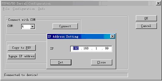 选择Tools菜单->PKV40-PB->PKV40SerialConfiguration,在弹出的对话框中选择相应的串口,然后点击Connect按钮连接到PKV,然后选择Configuration菜单中的相关菜单设置PKV的IP地址和子网掩码,如下图所示: