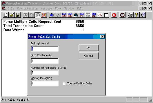 在计算机上运行ModbusTCP客户机软件,设置ModbusTCP服务器IP为,连接后用FC15写输出,如下图所示: