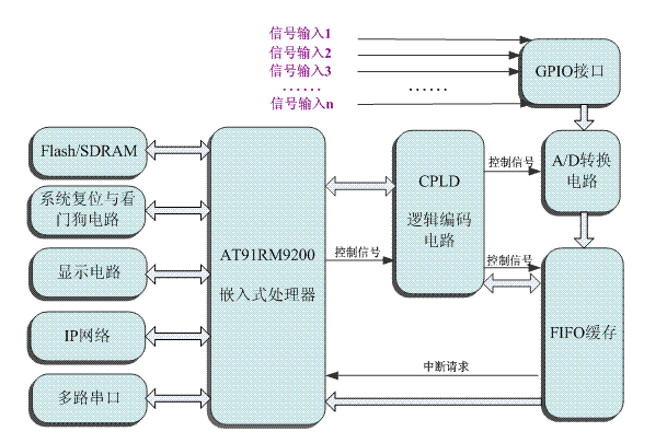 恒颐高科嵌入式高速数据采集系统采用ATMEL的32位ARM作为系统的CPU,单芯片集成多种功能。系统外围扩展了CPLD逻辑芯片作为协处理器,并扩展了A/D数据采集转换电路模块以及高速数据采集缓冲系统FIFO,可以实现高精度、高速率的数据采集;外围接口资源丰富;运行嵌入式Linux操作系统;面向石油勘探、环境监测、工业控制、医疗设备等领域,对数据进行采集处理和网络传输,实时及逻辑性能良好。硬件构成如图所示: