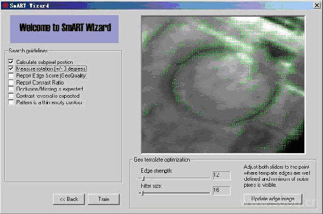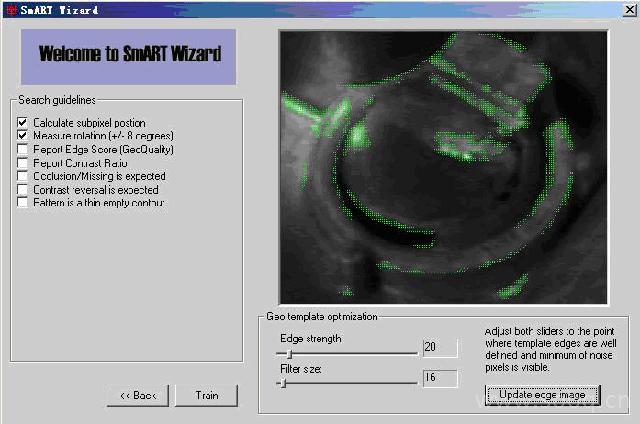由于待检测工件在生产流水线传输过程中不可避免位置会发生偏移动,因此在检测时我们必须在软件中对所拍图像进行自动定位。我们选取工件中两点作为定位点,下图是对第一个定位点进行培训学习: