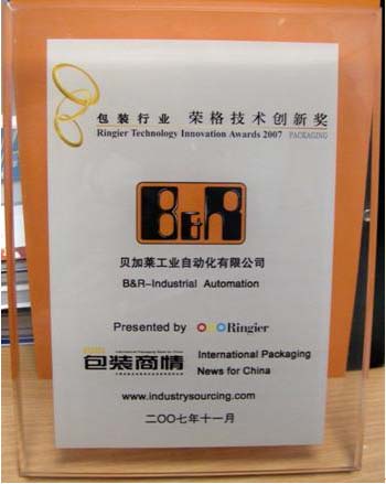 2007年10月19日,一年一度的包装行业荣格技术创新奖颁奖仪式在上海希尔顿酒店隆重举行。这一年度盛会由荣格旗下《国际包装商情》全力主办。评审团对2006-2007年度中国包装行业涌现的创新技术/产品进行了认真审判,经过用户推荐和专家公正评审,贝加莱包装自动化控制系统在众多竞争者中脱颖而出荣获“荣格技术创新奖”。