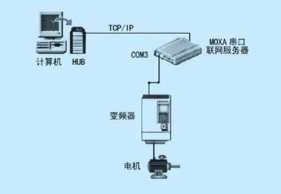 采用串口上网技术,实际上使变频器具有IP地址,并通过MOXA 串口服务器接入网络,使网络中的计算机可以对其远程监控。