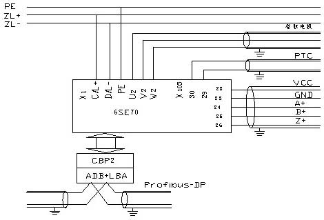 6SE系列变频器/逆变器在CUVC主板上通过ADB板上插入CBP2总线适配器连接到Profibus总线上,CBP2具有电隔离的RS485口,变频器通过CBP2的九针SUB-D的插接器连到Profibus总线上。主站能通过它对变频器进行运行控制操作、调节运行频率、更改变频器的功能码、读取变频器的运行状态。变频器也通过CBP2反馈对主站控制信号的应答信号,主站可以根据变频器的应答信号判断控制信号执行情况。
