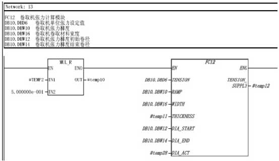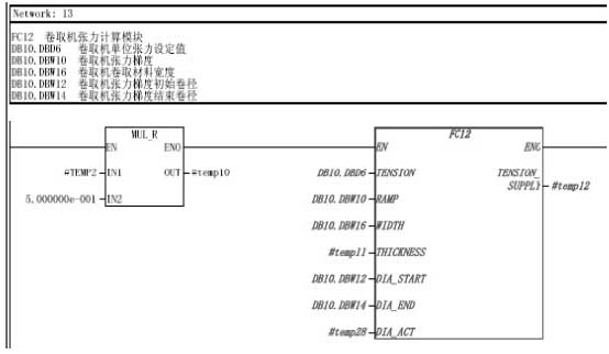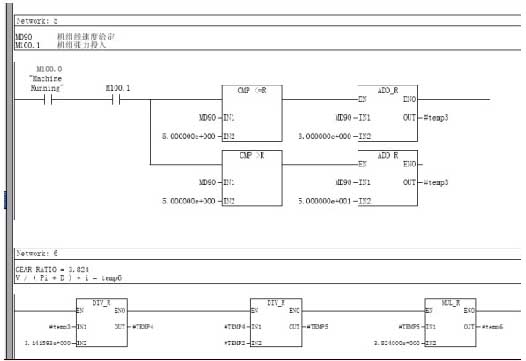 以上列出部分速度、转矩的梯形图,其他的如动态补偿模块、静态补偿模块限于篇幅、技术等因素,不在列出,将速度、转矩给定值转化为传动模块规定的量刚值,并由PLC传输给传动模块进行控制。