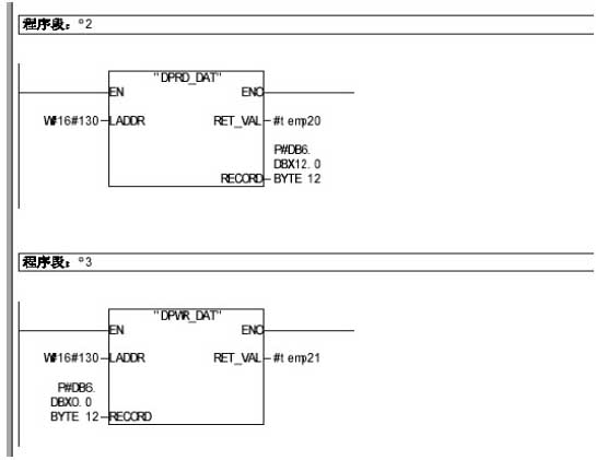 通过Drive ES Basic V5.1软件对变频器进行参数设置, 在周期性的通讯中,Profibus-DP使用PPO(对象过程类)类型作为数据传递的格式。它有5种PPO类型,根据信息量大小选择PPO类型,其报文中有用数据为PKW和PZD,PKW为参数识别值区,最多4个字,主要是读写参数 ,PZD为过程数据区,最多10个字,如:电流、速度的设定和反馈值等,主要是设定值和状态值。本条线采用的是PPO2类型,使参数P060=2,并存储在EEPROM中,参数便恢复到缺省值(工厂设定值),此后便可根据现场和工艺要求设定各装置参数。主要参数为P100控制模式, P101电机额定电压,P102电动机的额定电流,P107电动机的额定频率Hz,P108电动机的额定速度,以及各种工艺参数的选择设置等,参数P734与数据块DB建立数据连接,P918变频器地址等设定,然后下载到相应变频器,这样PLC就可以与变频器建立通讯链接,本例是在STEP7中的OB1组织块中调用SFC14“DPRD_DAT”、SFC15“DPWR_DAT”系统功能块同变频器进行读、写数据交换,梯形图如下。