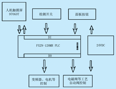 使用日本三菱公司的FX2N128MRPLC替换原系统使用的2台OMRON公司的C60P PLC,原系统的PLC由于是老型号产品,和计算机联机需要配置特殊的通讯转换器,系统需要增加外部I/O输入点时,扩展模块备件较难寻。FX2N128MRPLC是集成128点I/O的箱体式控制器,具有运算速度快,指令丰富、性能价格比高、联机编程简单、扩展方便等优点,是三菱FX系列中功能最强的小型控制器。