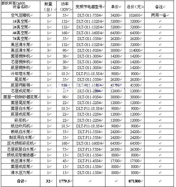 3、 备注A代表造纸线上的节电设备;B代表纸浆上的节能设备;C代表锅炉的节电设备。