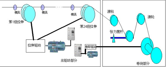 目前国产的拉丝设备有大拉丝机、中拉丝机、细拉丝机三类,每一类拉丝机中根据线径的不同又分为不同型号。大拉丝机和中拉丝机目前采用较多的依然是直流调速。但,近年来,随着交流调速技术的飞速发展,尤其是高性能矢量控制变频器的出现,交流调速性能已经接近直流调速的性能,同时,由于交流调速的方便和实用,大拉丝机和中拉丝机目前已经出现变频化的趋势。国产的细拉丝机主要是拷贝台湾版本的细拉丝机,最初采用的是单变频方式,也是目前生产量最大的细拉丝机。由于单变频控制的细拉丝机的滑差量太大,影响后工序---铜线漆包的质量。对铜线要求比较高的场合,这种控制方式往往达不到用户要求。于是双变频控制的、性能优良的细拉丝机逐步占领市场。