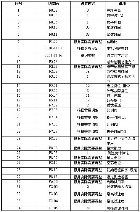 3) 收卷变频器的加减速。TD3300变频器的加减速度时间设置的较小为好,最好不要大于3S,而且要配置刹车电阻。如果卷筒变化率比较小的话(满卷与空卷比小于1.2),也可以不加刹车电阻,但要适当延长加减速时间。