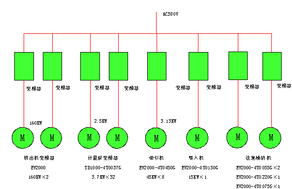 (1)挤出机部分,因负载比较大,并且要求要有较高的低频转矩,在变频器上选用的是EV2000系列产品,可以在0.5HZ时达到180%的转矩。