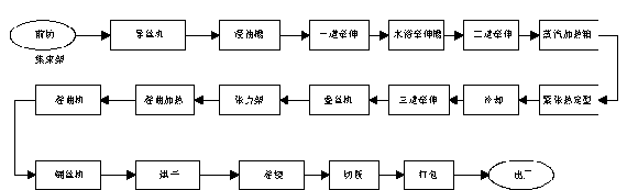 在前纺纺丝部分,生产完成后,所形成的丝束叠放在盛丝桶中,这种丝是未牵伸的丝,无法直接使用,尚需要进行进一步的处理。后纺部分牵伸就是对放在盛丝桶中的未牵伸丝进行再度的牵伸的,在后纺部分,需要经过热牵伸(牵伸比例3.2~3.6倍)、卷曲、热定型、切断、打包等工艺,做为涤纶短纤维成品出厂。