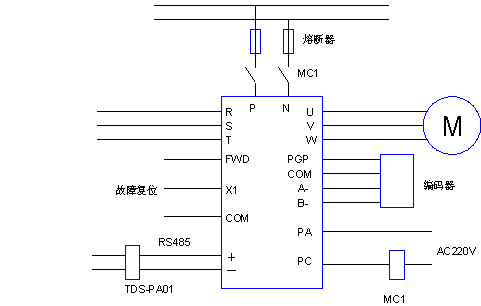 共母线的四台变频器都通过接触器和熔断器后,将自己的母线接到共用母线上面去,接触器的通断由变频器的PA-PC输出READY信号控制,针对共母线方案,在变频器的功能码当中还增加了一个功能FA.16(READY延时输出),在调试时根据变频器的功率的大小,设置不同的延时输出时间,保证先把功率大的变频器接到母线上面。每台共母线变频器的接线如图四所示,频率由总线给定,运行命令由端子给定。