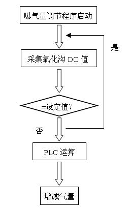 曝气供氧系统是由鼓风机、电动调节阀和溶解氧仪共同组成的闭环系统,为反应池好氧段提供氧气,并维持好氧过程的溶解氧浓度值。依照好氧过程的溶解氧浓度值控制鼓风机的开启程度,维持溶解氧浓度值在一定的范围内变动。控制流程如(图五)。